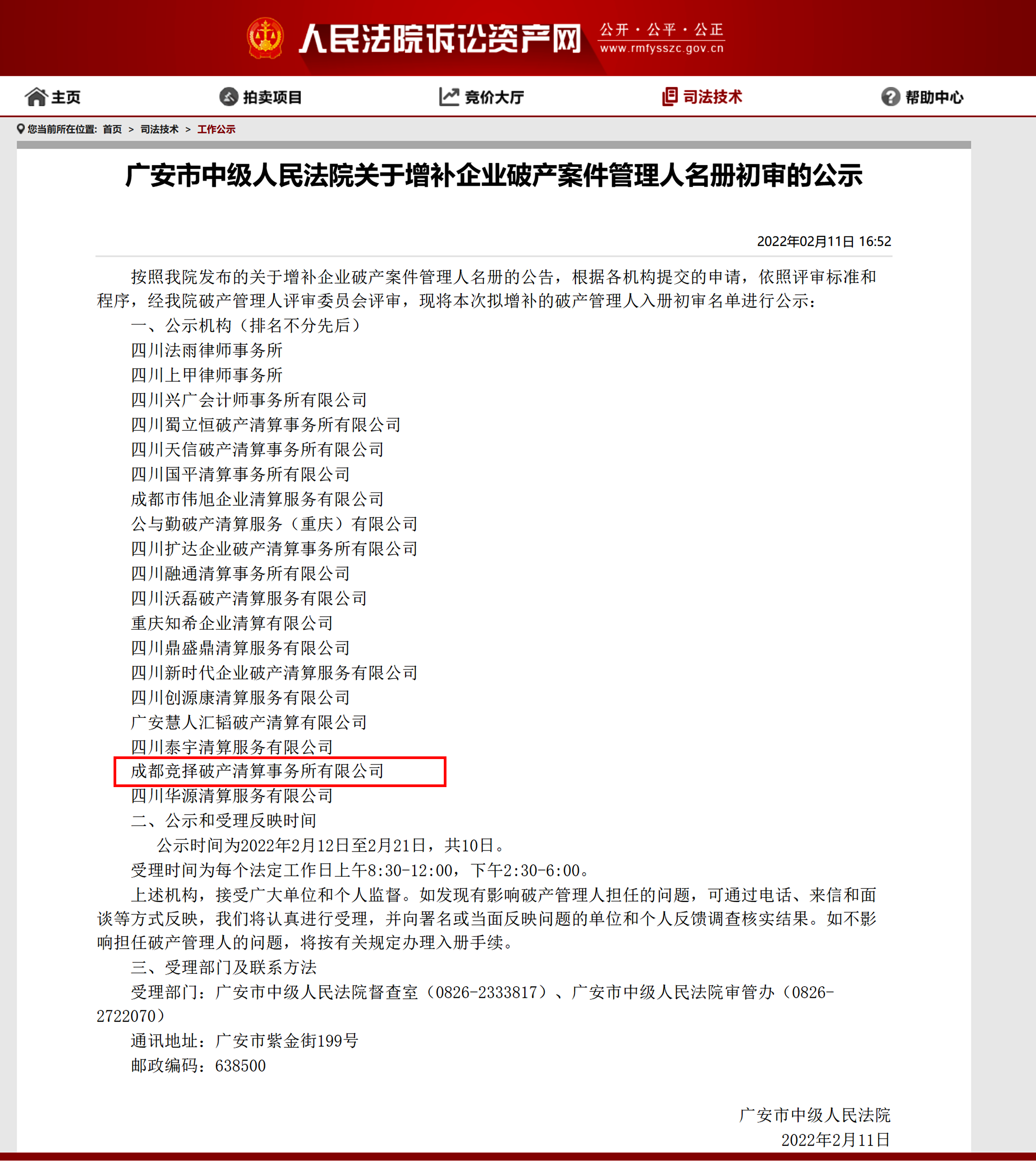 【管理人入册】本所候选广安市中级人民法院破产管理人机构名册
