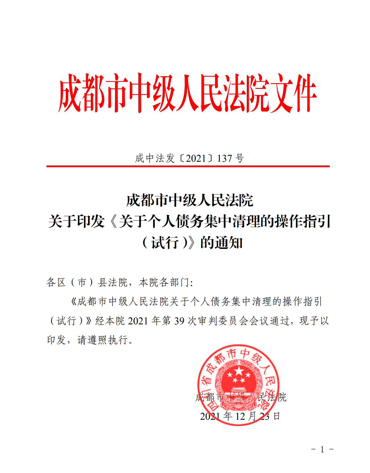 各区(市)县法院,本院各部门:《成都市中级人民法院关于个人债务集中清理的操作指引(试行)》经本院 2021 年第 39 次审判委员会会议通过,现予以印发,请遵照执行。