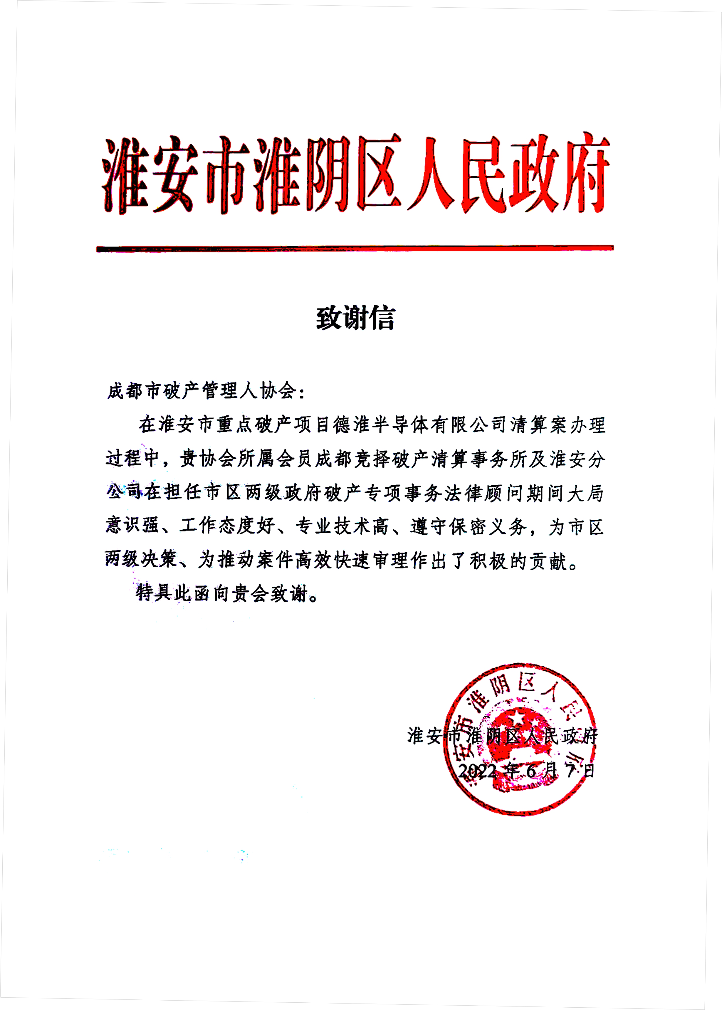 成都市破产管理人协会今天收到了江苏省淮安市淮阴区人民政府2022年6月7日出具的致谢信,称在淮安市重点破产项目办理过程中,协会会员单位成都竞择破产清算事务所及淮安分支机构在担任市、区两级政府专项法律顾问期间“大局意识强、工作态度好、专业技术高、遵守保密义务”,为市区两级政府决策、为破产案件高效快速审理作出了积极贡献,据此特向协会致谢。成都竞择破产团队系成都市一级管理人机构,自设立以来,一直以“律界精英、党政参谋、商界之友”作为团队建设目标,迄今已以管理人身份办理破产案件75件,已结35件,业务涉及重整、和解、清算、公司强清、预重整、执转破、个人破产、政府专项顾问等破产全领域。