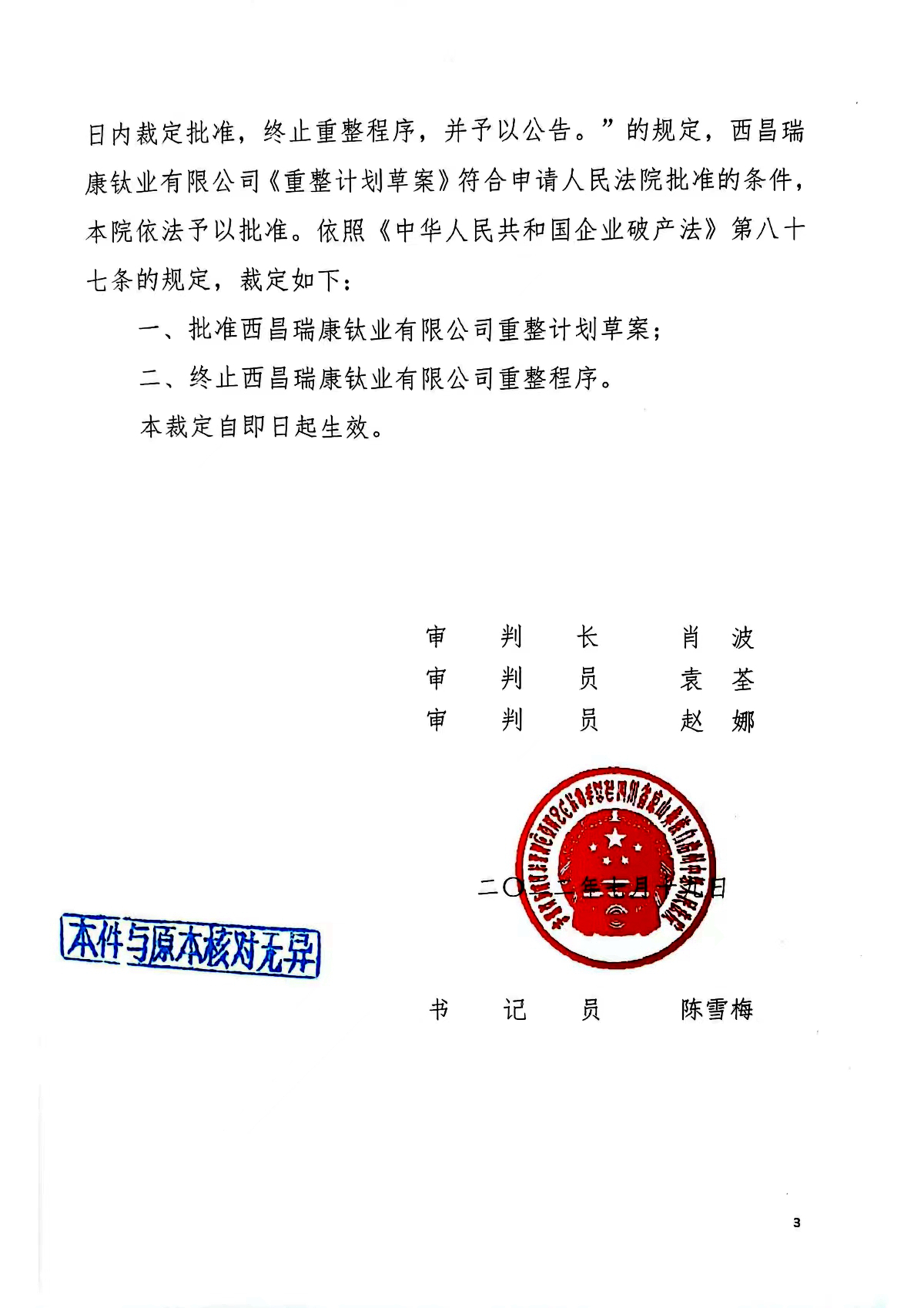 2022年7月19日,投资人四川聚信发展股权投资基金管理有限公司代理人、成都竞择破产清算事务所执业管理人行兆祥律师终于拿到了凉山彝族自治州中级人民法院批准西昌瑞康钛业有限公司重整计划终止重整程序的裁定书,这意味着已连续停产8年,险些被宣告破产的瑞康钛业得以重生。此案系本机构在破产管理人业务之外又一“打零工”的杰作,也是本机构鼓吹破产全领域业务的又一成功例证。