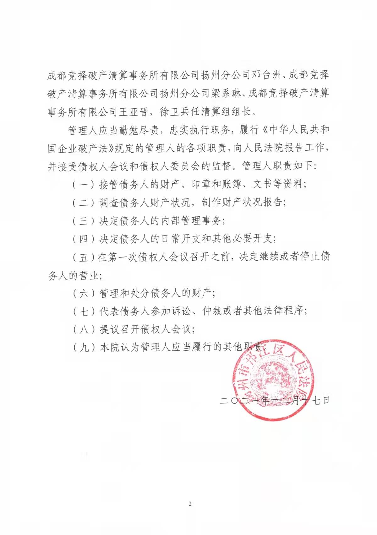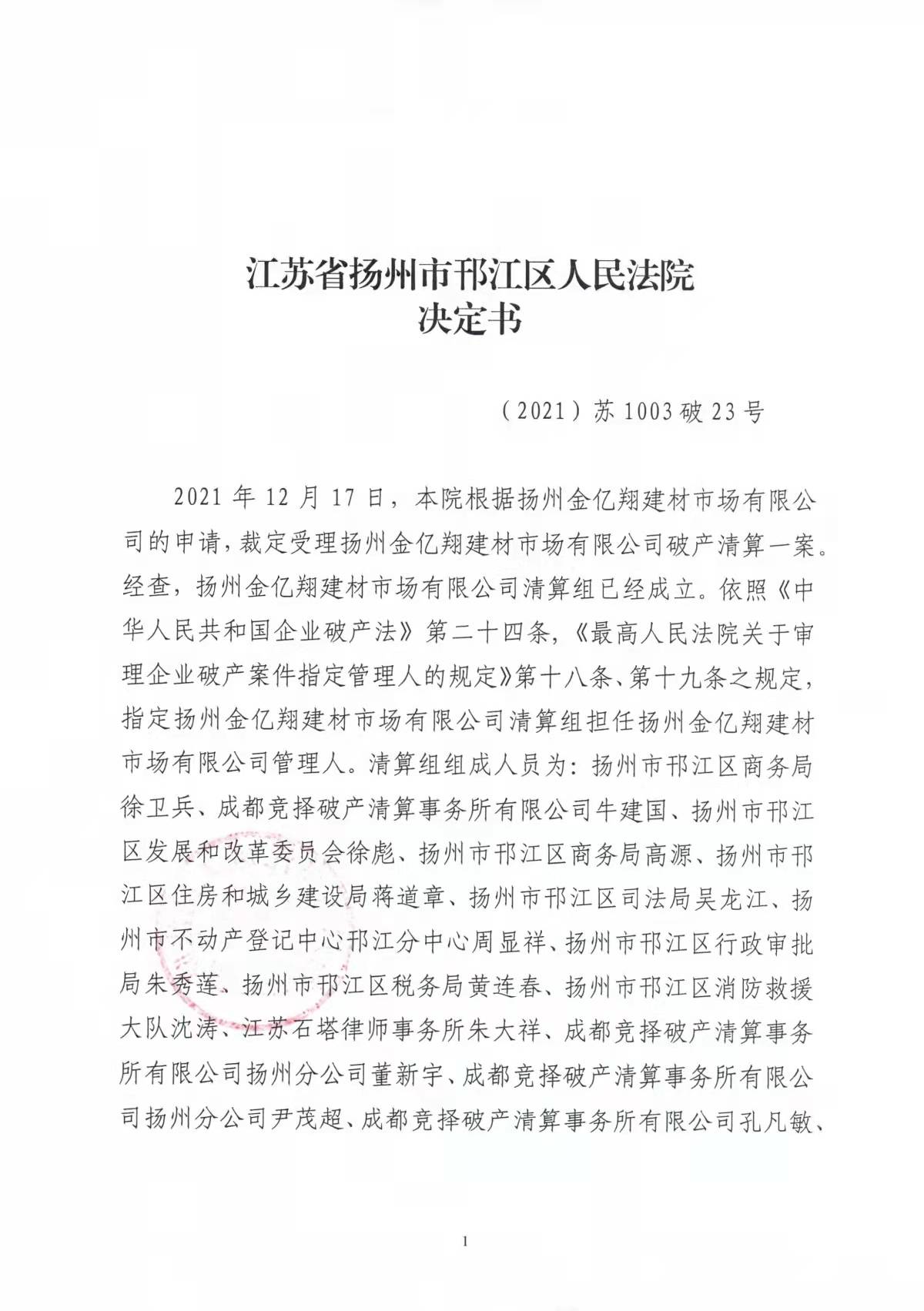 2021年12月17日,根据江苏省扬州市中院指定管辖,位于仪征市的金阳光集团三家关联企业扬州金亿翔建材市场有限公司、仪征金业企业管理有限公司、扬州盛竹生态农业有限公司被邗江区人民法院集中裁定破产清算,同时分别指定此前由邗江区人民政府决定成立的包括成都竞择破产清算事务所扬州分公司等单位人员组成的清算组为管理人。