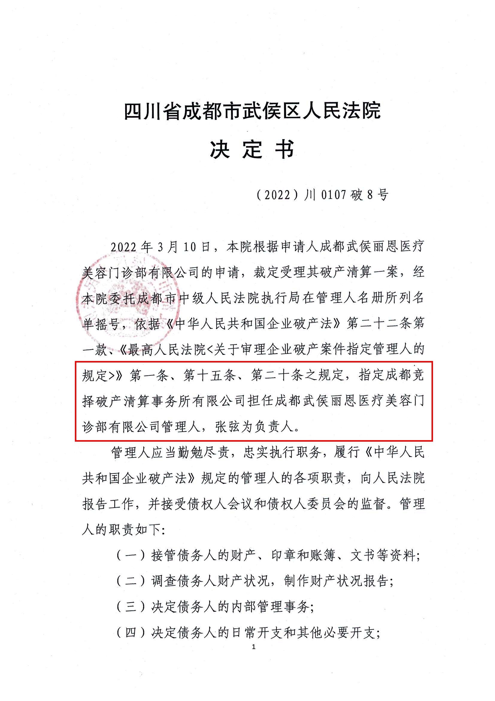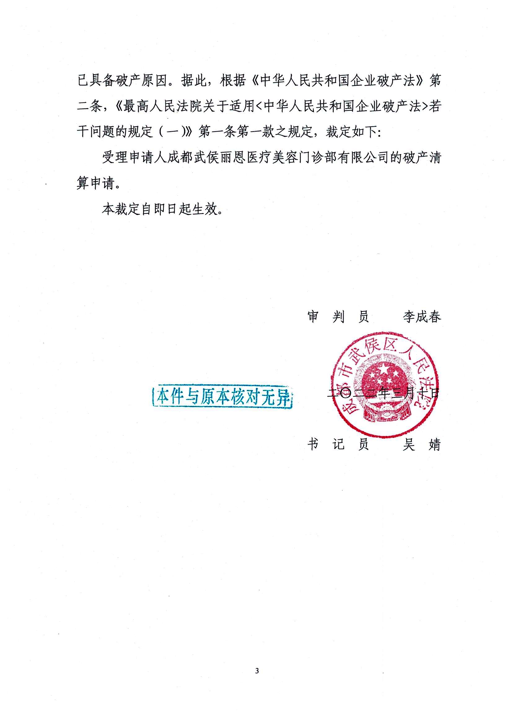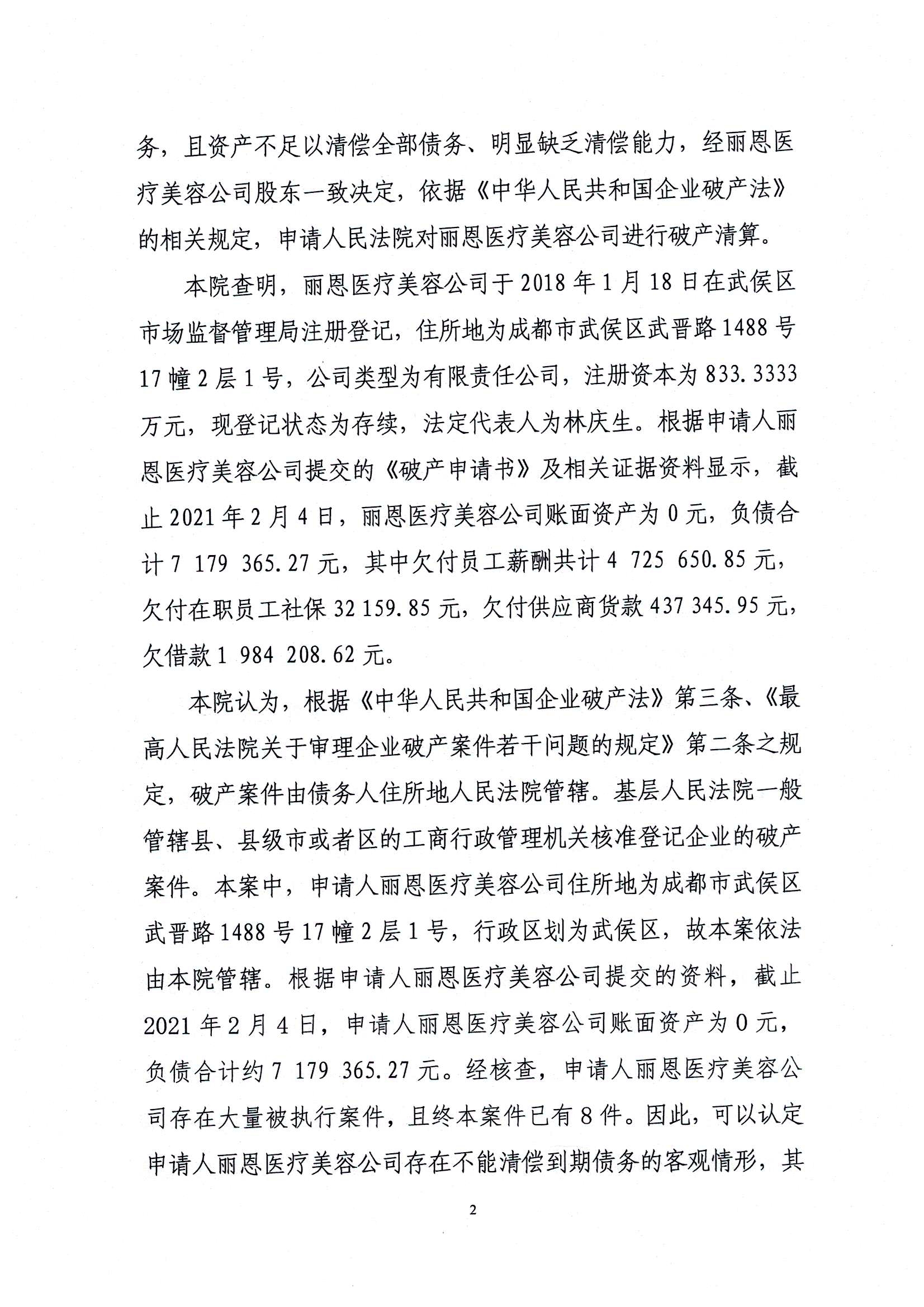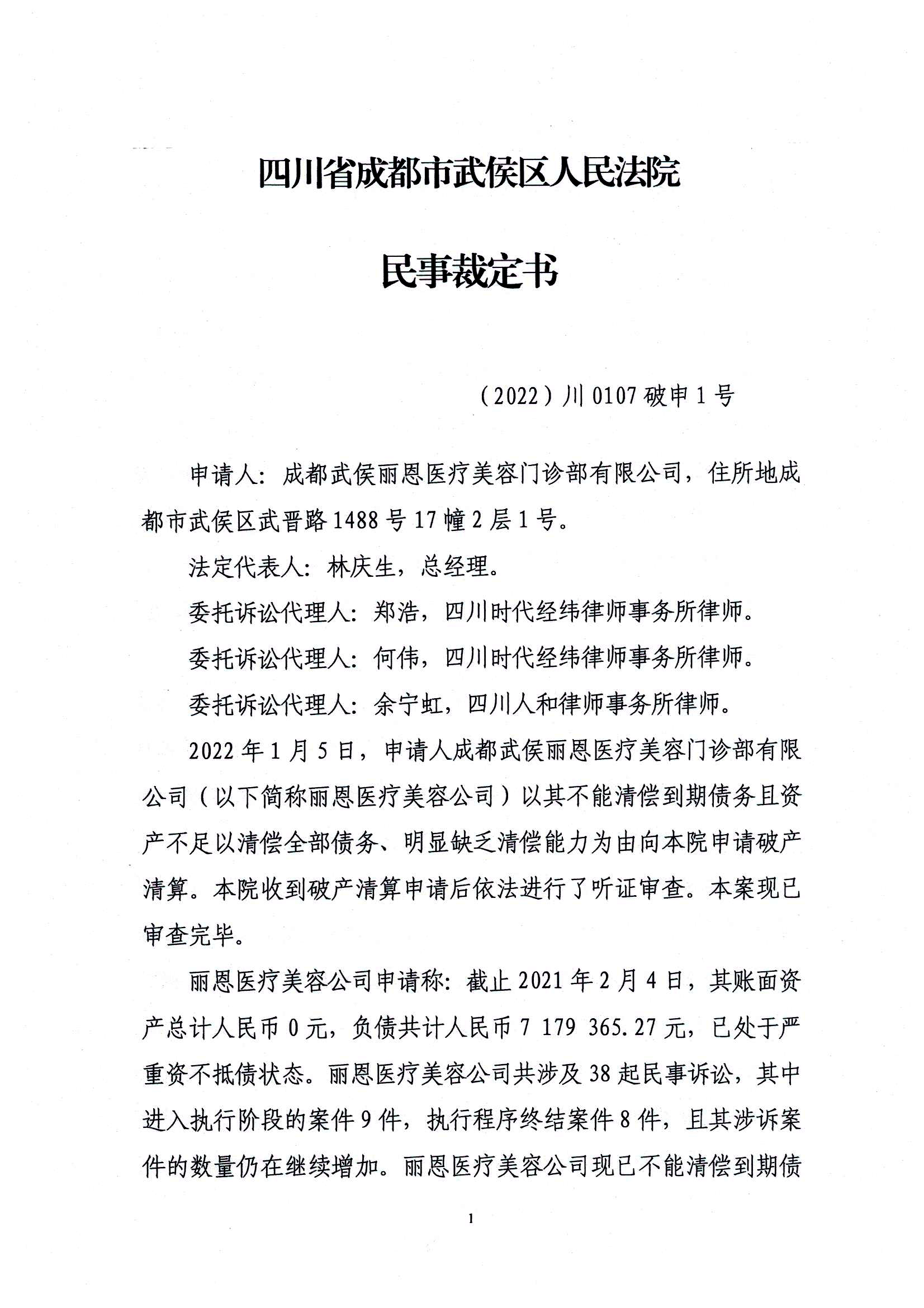 应债务人自己2022年1月5日的申请,成都武侯丽恩医疗美容门诊部有限公司以账面资产为0,资不抵债为由申请破产清算。经过受理前的听证程序,2022年3月10日,成都市武侯区人民法院裁定受理破产清算申请。