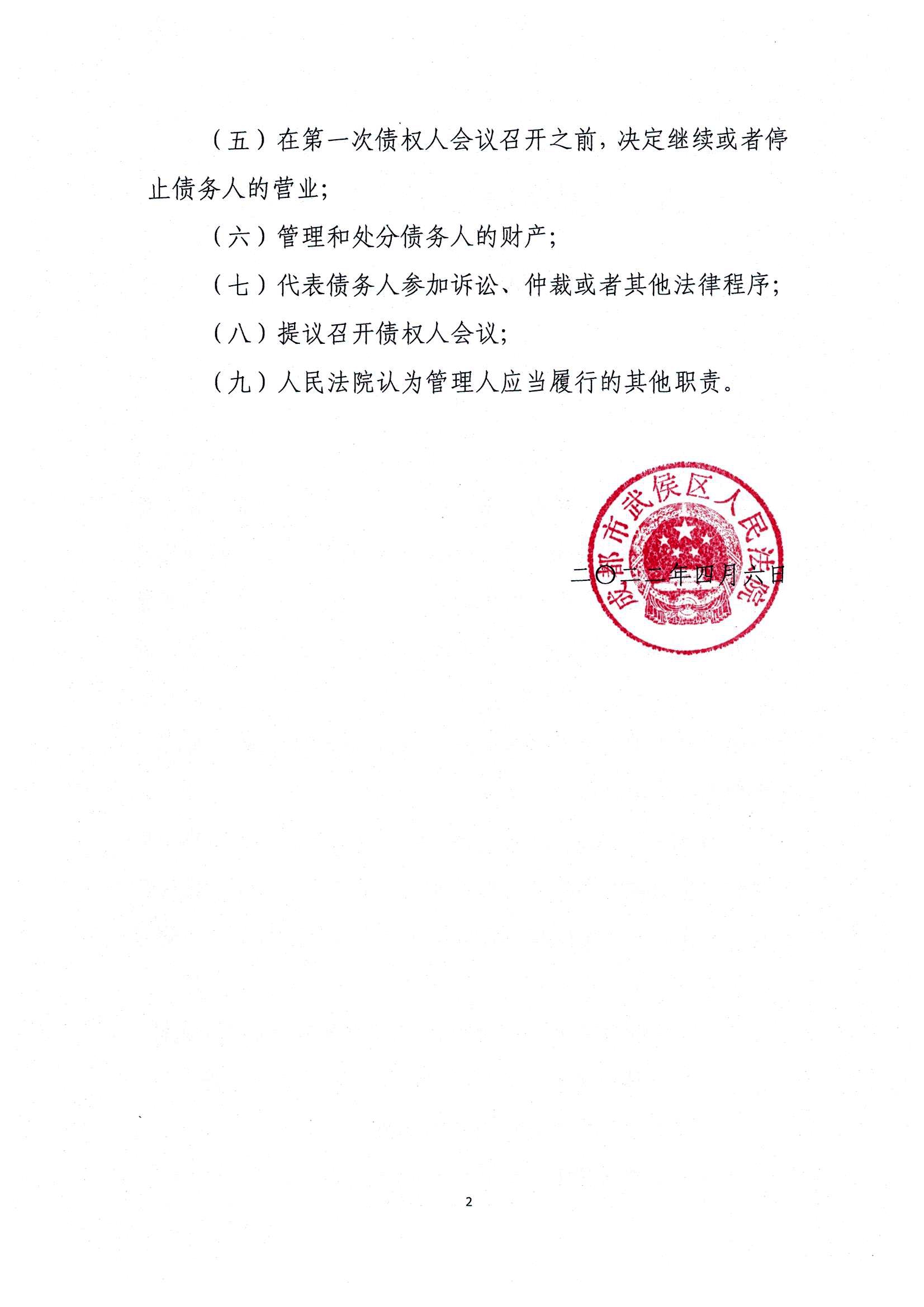 2022年4月6日,法院指定成都竞择破产清算事务所张弦律师为管理人负责人,请利害关系人留意重整网及本博公告。
