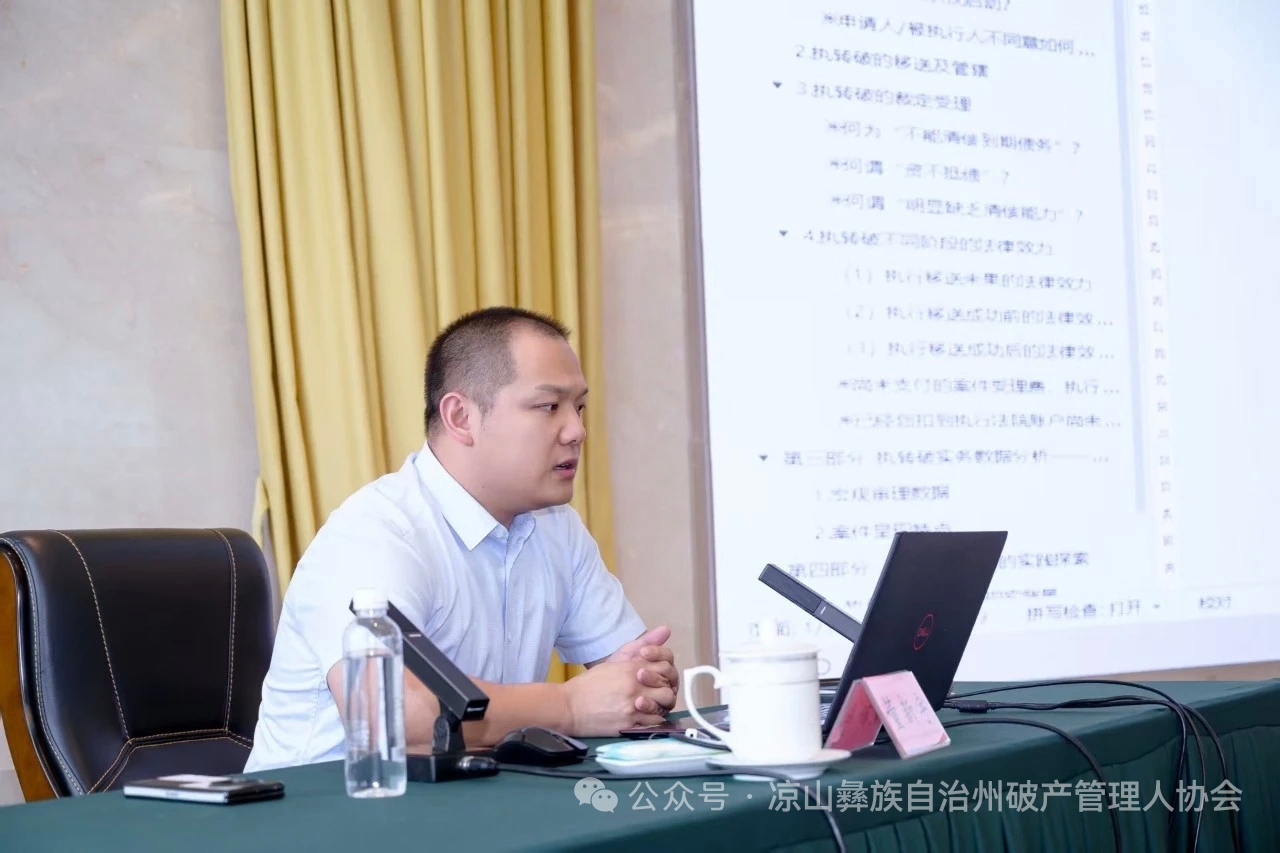 凉山州中院技术室主任罗碧琳、州破产管理人协会会长杨燕飞、副会长兼秘书长李卫、监事长黄佳出席会议。培训会由杨燕飞会长主持。